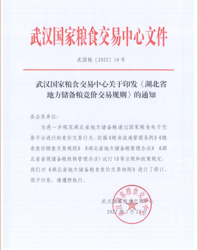 武汉湖北粮网关于印发《湖北省地方储备粮竞价交易规则》的通知